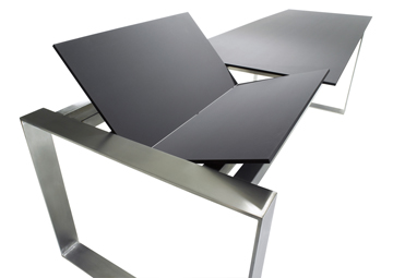 The NICEtable08 combines purist design with high-quality application of elegant materials. The frame is made of stainless steel and the tabletop of dark-brown suede-like Nextel lacquer. Its sophisticated pull-out mechanism makes it possible to extend the table to accommodate up to four extra seats.