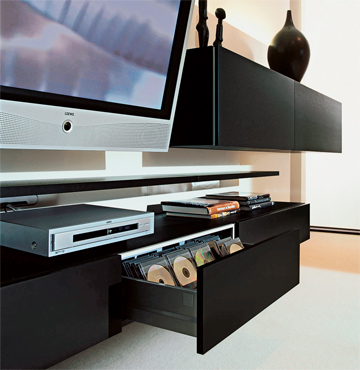 This construction is particularly focussing on its elegant functionality. Flat screens and varied accessories can be accommodated with a striking visual effect. As a floating wall in front of a wall the artena panel wall offers manifold possibilities of use. Corpus elements, especially robust shelves, heavy TV wall holders and other technical devices may be systematically, individually and invisibly stowed away. Moreover, the panel construction with a thickness of 8 cm allows optimum and discreet wiring. Furthermore, the panel wall has the advantage that corpuses up to 56 cm thick can be inserted in a pending position. The laterally protruding elements create an expressive form, which can be shifted inwards or designed flush-mounted. This design detail lends the fronts the optically neutral effect of a facade; all the same, they are elegant and fulfil their functions.