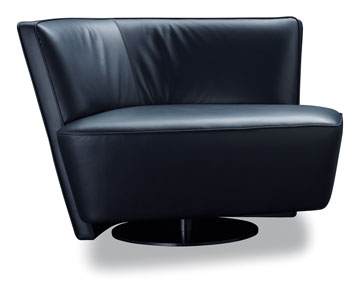 Even by itself, the Drift armchair has an autonomous look to it; as a pair it conforms to its original idea. Placing the armchairs in a mirror-image arrangement results in what appears to be a small, private communication centre. In everyday life, this lively use produces a captivating contrast to the rather puristic appearance of the armchair, which combines interesting contradictions: the large, curved form of the backrest and the opulent volume of the seat cushion generate a suggestive moment of suspense. The chair rests on a rotatable base plate so that the user can turn comfortably towards his opposite number. The swinging backrest also serves as a generous armrest. The chair is available in two variants, each with a mirror-image shape, and in different fabrics and leather in many colours to choose from.