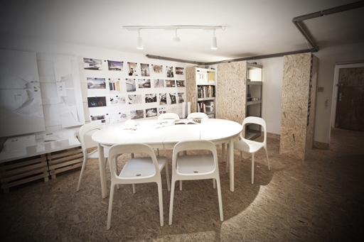 辦公司位于一個校舍的地下室里面。這里完全就是一個舒適的世界。白色的墻面適合展示。刨花板地面非常舒適,桌子也是刨花板的,桌面包一層皮革,讓辦公更為得心應手。刨花板造價還非常的低廉。