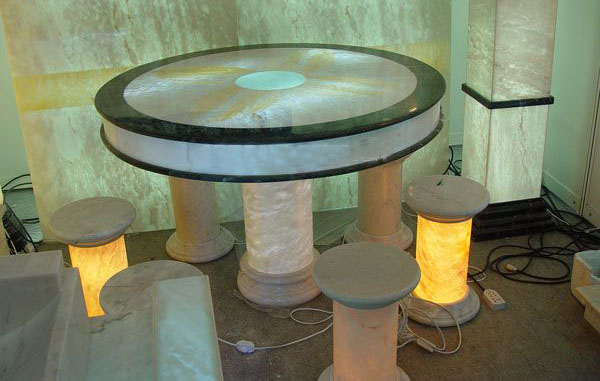 象牙玉的透光性極好,常用來(lái)做各種小藝品,如透光桌面,透光圓柱等。