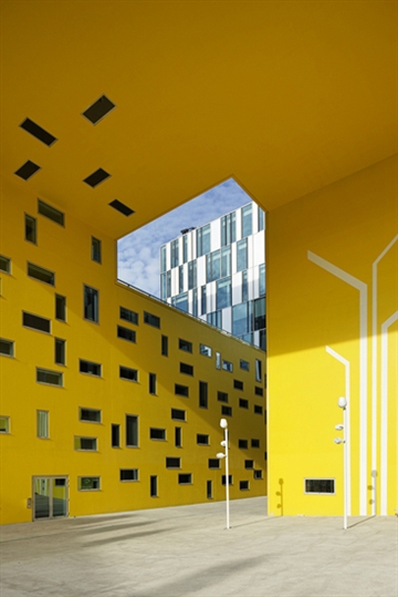 建筑有一層透明的銀色表皮和一層明亮的不透明黃色表皮。組合的邏輯非常簡單,形成的效果卻清晰直觀。黃色表皮對光的反應非常豐富,同時給通過的人帶來陽光般的體驗。