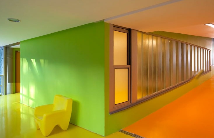 建筑可以理解成四個卷兒建筑被一個開放的大陽臺連接在一起,整體呈U型。有院子的一側(cè)朝向臨近的森林公園,很炫的外表皮則朝向公路。兩個大卷兒(橢圓形)建筑里面主要是教室,兩個小卷兒(水滴狀)建筑包含各種次要空間:辦公室,藝術(shù)室,圖書館,電腦教室。這四個分開的建筑,其形式非常符合當?shù)貧夂颍欣诳諝獾牧魍ê妥匀焕鋮s。許多墻壁是用的是半透明玻璃,使得教室采光更加好,并降低能源的使用。學校也在努力開發(fā)屋頂花園,使其能夠成為學生學習和游戲的地方。