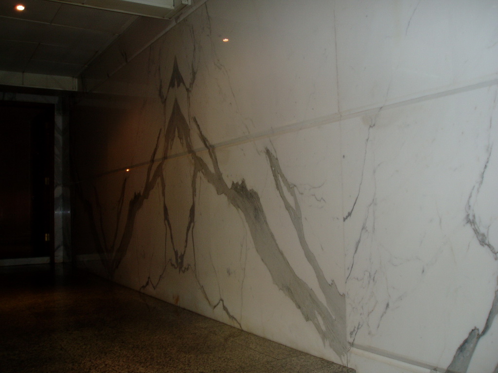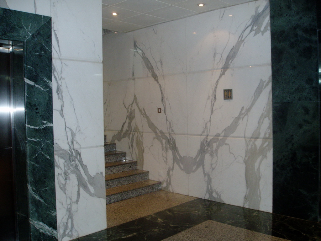 石材對花即把同一塊石板對剖之后往兩邊展開,所得兩片薄板能夠鏡像般地相似,它給人一種的不同凡響的鏡像視覺沖擊力,彰顯石之高貴、優雅。 廣州國際信托大廈雪的墻面大面積使用雪花白對花效果,大氣莊重。 了解石材品種雪花白,請點擊雪花白 了解更多石材墻面設計,點擊專題“墻面設計與石材應用”