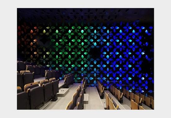 在白天,建筑物的表面是單色的反光表面。在晚上,在巨大的柔和的照明表面上,彩色的燈光產生了一種波浪的效果。整個照明系統是由電腦控制的。
