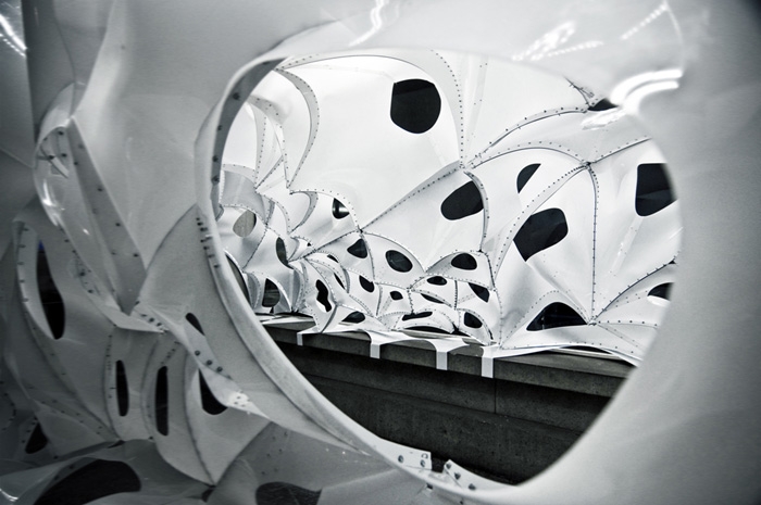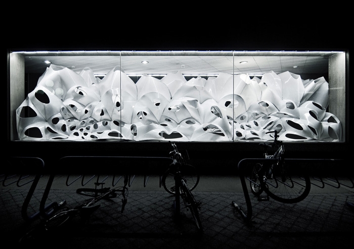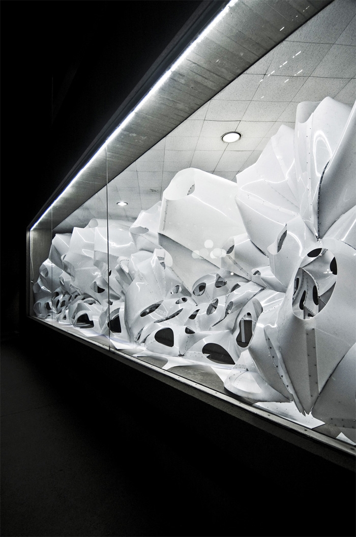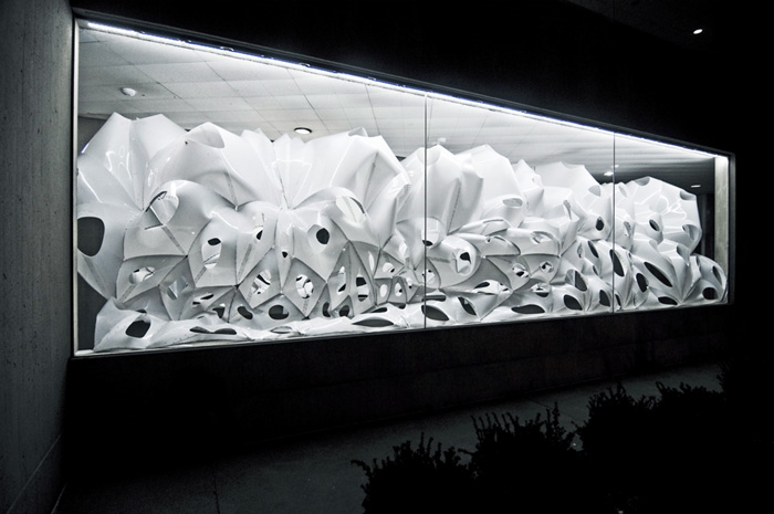 這是Skylar Tibbits為麻省理工(MIT)150周年校慶和FAST藝術節(jié)所作的作品:VoltaDom。安裝在校內(nèi)55樓,56樓之間的走廊上。玻璃與混凝土組成數(shù)以百計拱肋結構物,這拱形天花板就像歷史悠久的教堂。材料的厚度不一致,光能不同程度的穿透其,并反映在對周圍環(huán)境的影響上。