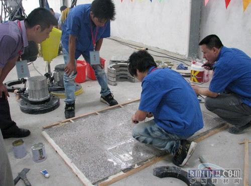 賽前,各參賽企業(yè)認(rèn)真?zhèn)滟悾盒遁d和安裝養(yǎng)護(hù)器材、清理和填縫石材……,賽場(chǎng)上,各參賽企業(yè)使出渾身解數(shù),充分施展各自先進(jìn)的石材護(hù)理設(shè)備與石材防護(hù)、調(diào)色填縫、打磨、拋光、晶面處理等技術(shù)方法,讓人目不暇接,嘆為觀止。