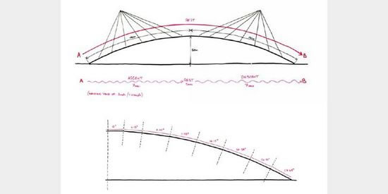 這個設計方案的創意來自悉尼著名的“海港大橋”(Harbour Bridge)。這座橋梁的長度為500米,它的最高處距離水面134米。
