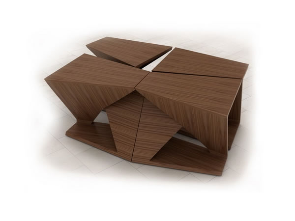 這個名為Xcentic的咖啡桌看起來就很有意思,像一個跛腳行走的木頭人。但這還不夠吸引人,它其實是靠形態取勝的。它兩條“交叉腿”的連接造就了兩個平面和一個空間,上面可以作為咖啡桌,中間可以翹腿,下面有可以放書籍和報紙。當把它組合起來,就可以作為大桌子使用,更可以分開來做板凳。它是對稱的,只需簡單的切割和裝飾就可以制成,低成本。