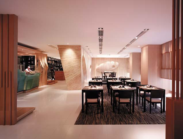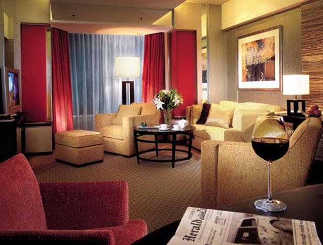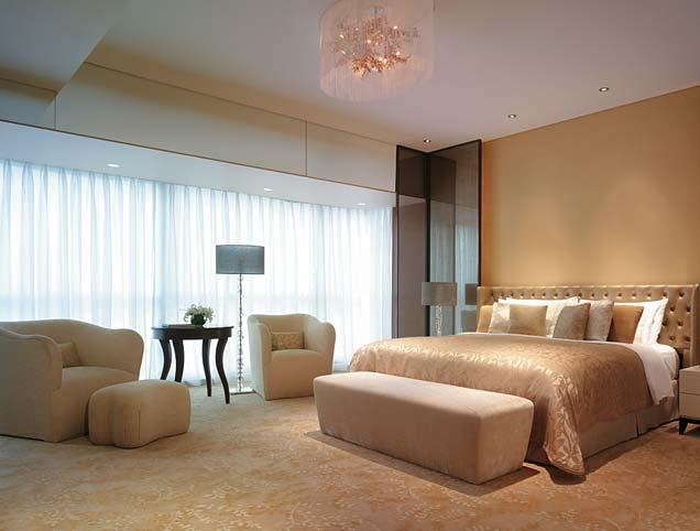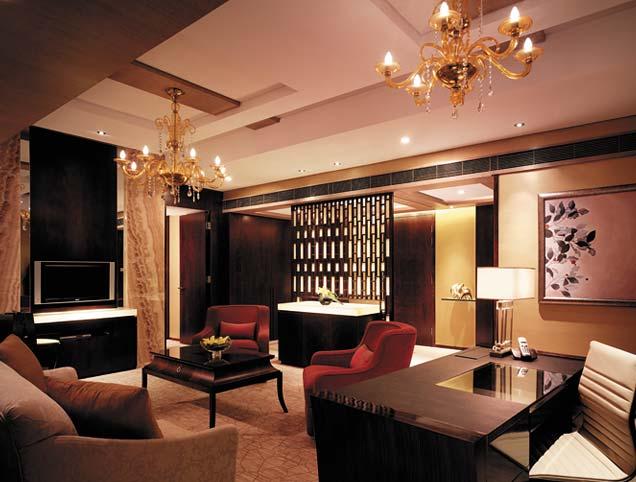 該酒店在大堂及游泳池宴會廳等地方使用了大量的天然大理石,進一步突顯香格里拉酒店的尊貴及優雅品味。如酒店前臺使用的透光橙玉石吧臺,地面使用米黃類大理石。