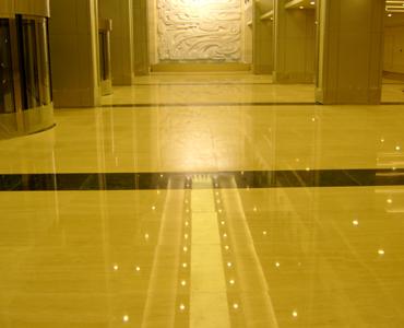大理石地面淺層翻新按照前后左右的次序,選取大約四平方米的地面,在區域周圍做好安全保護(擺放護欄及黃色警示牌)。使用擦地機配鉆石墊連接片,400#鉆石墊加清水打磨地面。注意,打磨過程中需逐漸加水,保持地面濕潤??梢允褂霉嗡鞴伍_污水檢查效果,一般需要十分鐘左右。再換800#或1500#鉆石墊用上述相同方法打磨。以兩平方米一勺的標準,把大理石拋光晶面劑放在地面上,加少許水。使用擦地機(最好使用加重型的擦地機)、針盤和紅墊,對大理石進行打磨。不時地加少量的清水,防止晶面劑的干透。重復打磨及加水的動作,根據此大理石的實際情況,四平方米的地面大約需打磨十分鐘左右??梢杂貌AЧ螚l來檢查地面的亮度。用玻璃刮條把遺留下來的晶面劑刮到下一塊的區域(這些還可以被循環使用)。接著打磨下一塊區域。在幾塊區域結束以后,整體進行徹底的清洗。地面徹底干透后,使用擦地機配合白墊干拋清潔地面,并推塵。淺層翻新完成。大理石拋光晶面劑的使用量:20—30克/平方米。水磨片五片一組共三組,可打磨300—500平方米。