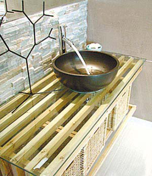 3招創(chuàng)意為廚衛(wèi)家居增色。衛(wèi)生間的干濕分區(qū),造就了木質(zhì)的浴室柜“登堂入室”。這個浴室柜展現(xiàn)的是一種自然而簡樸的魅力。木方打造的框架,清玻臺面,中間放幾個隨處可以買到的藤籃,簡單、實用,有一種通透的美感。