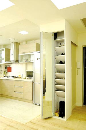 這里把廚房的墻打掉,做成了開放式廚房,為的是增大廚房的使用空間。但是廚房的位置剛好在大門旁,沒有了墻,鞋柜怎樣放呢?設(shè)計師把其中的一面墻做成柱式的鞋柜,鞋柜門還增加了一面全身鏡,讓主人在出門前可以整理儀容。這樣一來,廚房增大了,鞋柜有了,還有一面穿衣鏡,可以說是一舉三得。