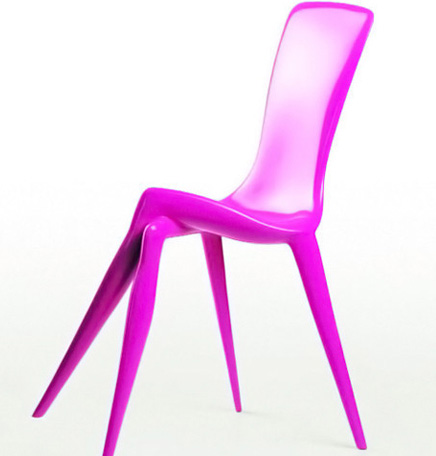 相比于上邊的設計,這組座椅的曖昧暗示意味簡直是到了限制級,尤其是前一張,前后的站姿,女人踮起繃直的腳尖,男人強勢的站位,這樣的暗示實在是到了曖昧的極致。而后一張同樣不遜色,瑰麗的玫紅色,前面的椅腳設計成交叉的女性雙腿,性感而不失魅力。