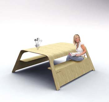 這款餐桌看起來就像是用一塊單獨(dú)的木片制成,然后在再兩邊摳兩個(gè)洞,將木片折進(jìn)去,就成了椅子。給人很強(qiáng)的視覺沖擊。當(dāng)然,實(shí)際的工藝會(huì)復(fù)雜得多。