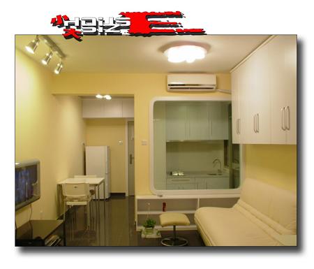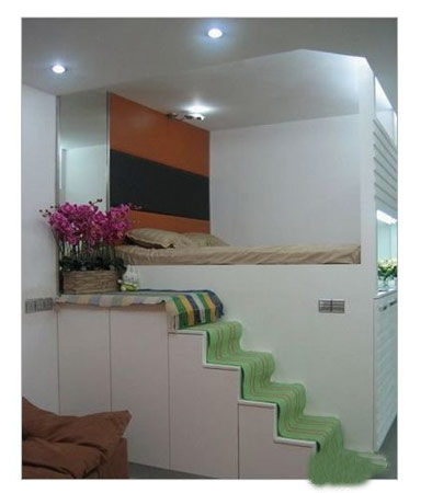 首先房型是不規則型,在有限的面積內,給人以空間的擴張感,相當了不起。請注意: 那上面是張床。