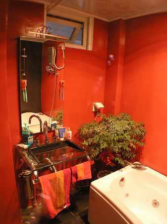 濃郁的紅色與金屬質地的玻璃臺盆形成了柔與剛的強烈的視覺感