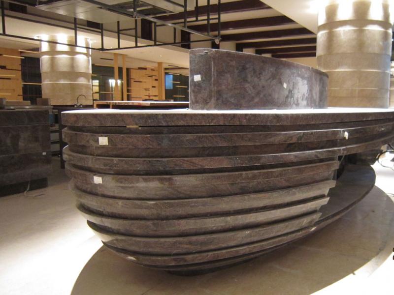 這個蛋形設計所用材料為花崗石幻彩紫,這類異形產品通常使用的設備包括五軸電腦加工中心、電仿機等。其中五軸電腦加工中心可加工任何截面造型的產品及平面雕刻等復雜產品,電仿機用于圓弧板修切、旋梯、錐形以及異形產品切拼角等。