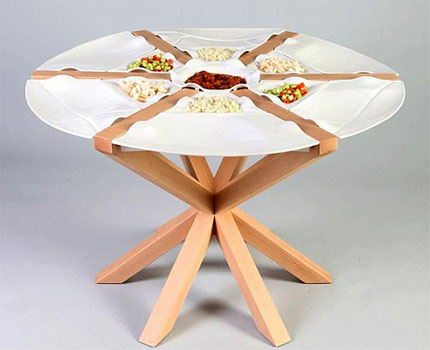 這款桌子來自設計師Elad Kashi的設計,桌面配有一些特別設計的可移動陶瓷盤子,別致的造型與簡約的桌子搭配起來時尚有特色。