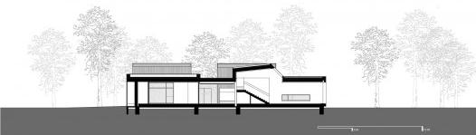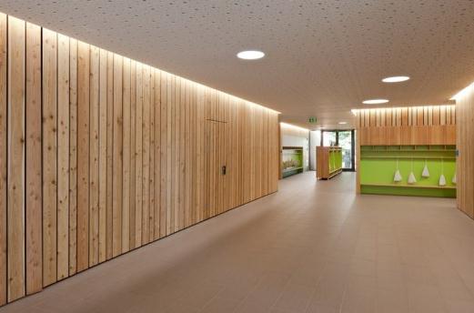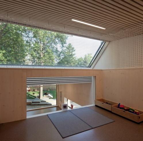 這個幼兒園位于一片栗子樹林里,它純樸的設計宣揚的是一種開闊的空間和與周圍可愛環境的聯系。為了滿足兒童們不同的需要,建筑圍繞一系列結構排布,每個結構都從視覺上與樹木相連。教室圍繞一個走廊排布,通過走廊進入前廳,這里的落地玻璃展示出絕佳的景色。多功能前廳通過教室和健身房也可進入,這使得教課可以靈活進行,不同的活動也可同時進行。在特殊時期,健身房和前廳之間靈活的分隔墻還可以被打開,以提供一個更大的房間。不像開闊的教室空間,走廊是由天窗照明,樹木通過天窗往里投來一瞥,為人們創造親密的氛圍。每個教室都有巨大的能看見全景的窗戶,它們與孩子們的視線齊平,還有很多低矮的窗臺可以作為凳子用。