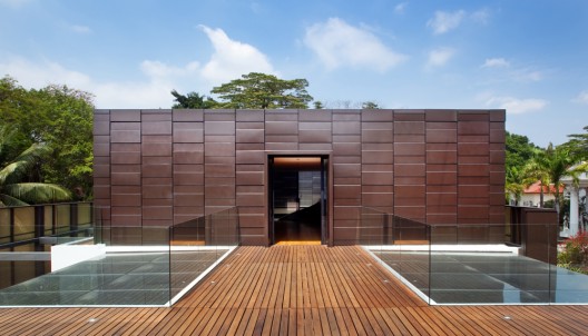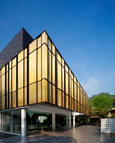 這個住宅的設計是為了定義并模糊公共空間和私人空間之間的視覺過渡,住宅的透明度依次遞減,清晰的表皮展示出日間起居的開放性和透明性。界限墻過渡于室內室外,在玻璃墻后面是一排竹子屏風,它是金色網格結構的前景,同時充當首層玻璃盒子的背景。中間的盒子是住宅的主要特征,它表面用金色網格網住。這個金色網格是私人二層玻璃區的一個光幕,夜晚金色幕布將消失,將室內的活動展示出來。閣樓是一個不透明的盒子,上面覆蓋鋁制板面,形成平靜但輕盈的感覺。