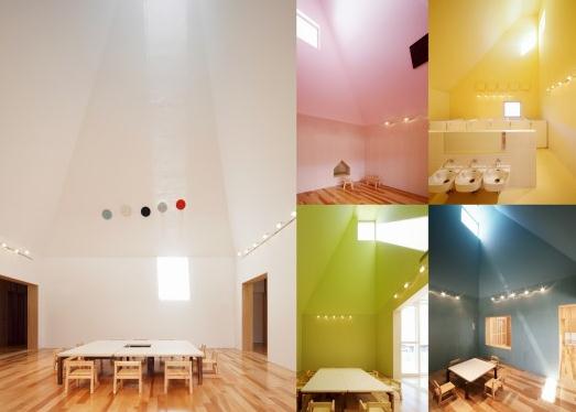 這是一個為零歲到五歲孩子們設計的幼兒園,它位于日本長濱市郊區,學校是一個單層的結構,空間之間,空間和室外景觀之間都有很大的透明性,另外光井被放置在了幼兒園的最主要位置。這里所說的光井是圓錐形的不同大小的屋頂結構,它們還有不同的顏色,朝向不同的方向,從而將光線吸入室內空間,同時這些光線還會隨著時間和季節發生變化。這些像煙囪般的光井從遠處看別具一格,它們的陰影投在毫無變化的郊區環境中,為其增添了更多特點。