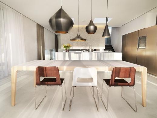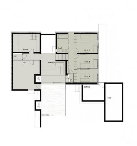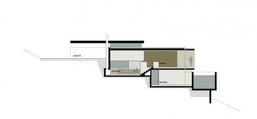 這個位于林地旁邊的住宅沿著陡峭的斜坡向下延伸,周圍環繞田野和果林。森林保護和區域劃分及當地的規范只允許建筑位于場地的東北部,設計目的是為了融合森林邊緣場地的獨特性,確保與普通住宅相區分,同時使住戶能有山谷的美好景色。建筑的平面由建筑窗戶定義,它們隨著場地地形排布,被拆開分為不同的層次,與室外空間相互作用。一個暴露的帶有鋪石板的混凝土軀干是住宅的中心。分開的層次使所有樓層都有不同的天花板高度,院落被嵌入在上層樓面,它從四周為房間帶來光線,而鄰里一側則是一個巨大的封閉的表面。