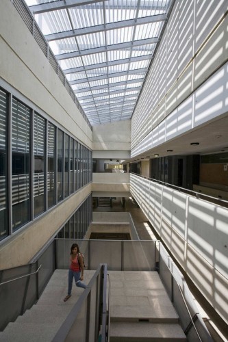 這是波多黎各大學的一個擴建項目,新增部分是一個四層的混凝土大樓,它的東立面包括一個具有紀念感的雕塑結構,它呈現出彩色的孔狀鋁結構,為大樓提供遮陽和保護作用。墻上的淺浮雕,加上穿孔的開口使風和陽光能透進大樓內部,是一個美麗的擋光板。