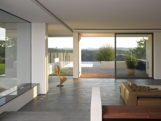 近看住宅每個(gè)結(jié)構(gòu)都可以是單獨(dú)的體量,但從遠(yuǎn)處看,它們則是一個(gè)統(tǒng)一的整體。從東北側(cè)的入口大廳進(jìn)入住宅后,首先是一個(gè)沖著西南面的落地大玻璃窗,它將花園里的景致盡收眼底。整個(gè)住宅內(nèi),人們到處都能感受到開(kāi)闊和封閉空間之間的互動(dòng),透明的玻璃和保護(hù)性的墻壁交錯(cuò)延展。這種布局滿足了客戶對(duì)安全性隱私性的需求,但同時(shí)為其提供與自然環(huán)境的親密聯(lián)系。