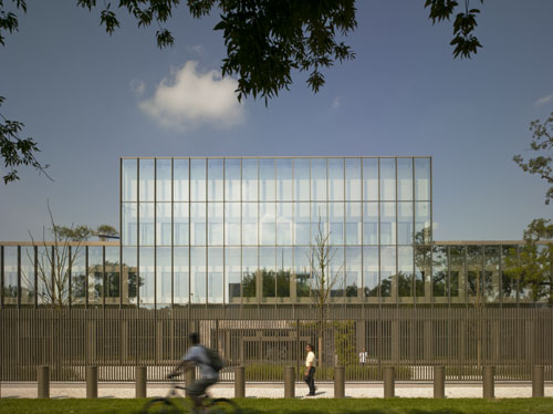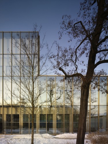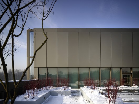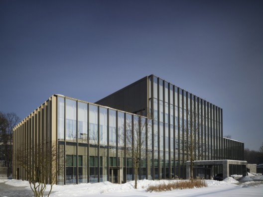 建筑一面朝著Ulica Kawalerii,一面朝著一個公園,呈現(xiàn)出平靜和正式的儀態(tài)。它長長的形式中間由一個閣樓主導(dǎo),給人以基礎(chǔ)的新古典主義風(fēng)范,修長的墻壁及環(huán)繞場地的圍欄更是加強了這一效果。建筑在節(jié)能方面非常突出:玻璃立面充當(dāng)一個雙層表皮的外立面,它能在冬季為建筑提供足夠的熱能,同時在夏季幫助降溫。外表層是銅色的鋁制豎框和鏡面玻璃,它們反射天空和周圍的綠樹。