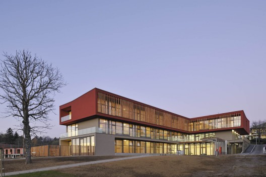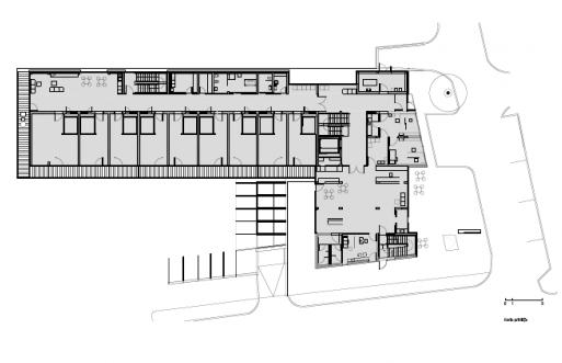 Hodoš老年中心位于Hodoš鎮(zhèn)子的中心,連同學(xué)校,政府大樓一起形成社區(qū)活動系統(tǒng),除了普通的為老人準(zhǔn)備的房間,它還包括為其他人準(zhǔn)備的公共空間。設(shè)計呈現(xiàn)出清晰的L形體量,首層是紅磚色,與周圍紅色的屋頂相得益彰,營造出現(xiàn)代的氣氛。