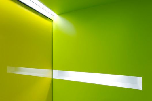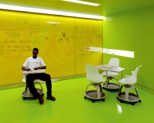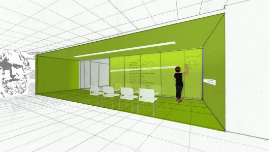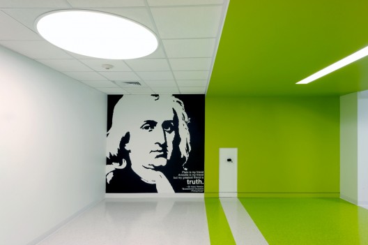 這次對(duì)密蘇里州立大學(xué)大廳的翻修生成了一個(gè)新教室,一個(gè)為數(shù)學(xué)系設(shè)立的新電腦實(shí)驗(yàn)室。一個(gè)非正式的學(xué)生休息大廳被安置在走廊的交叉口,它呈現(xiàn)出新鮮的綠色,使空間從一個(gè)功能過渡到另一個(gè)功能。這個(gè)綠色的圓環(huán)空間是學(xué)生休息室的一部分,它鼓勵(lì)師生間的友好互動(dòng)。靈活的座椅和互動(dòng)的玻璃墻鼓勵(lì)自由的討論和學(xué)習(xí)。牛頓的肖像位于中央走廊的結(jié)尾處,形象逼真,似乎是在與學(xué)生們做伴。