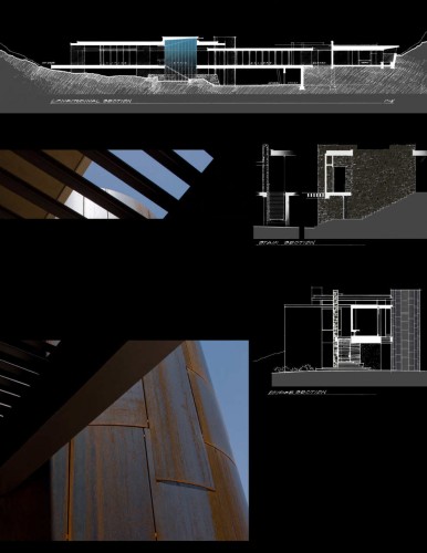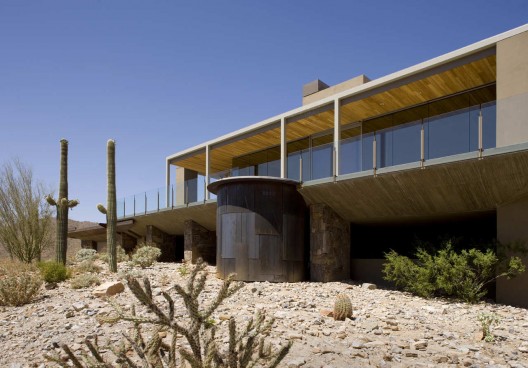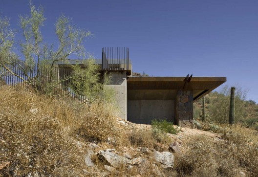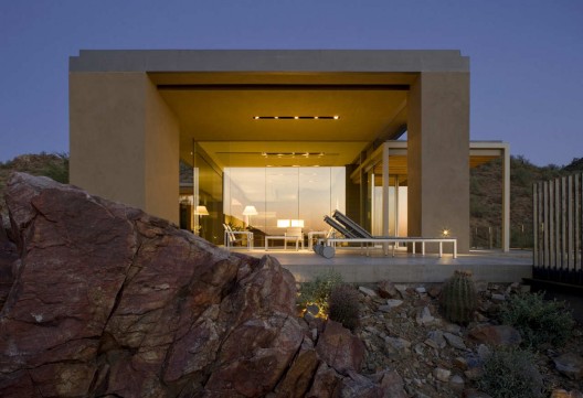 這是沙漠上一個簡單的住宅,它尊重沙漠,提升場地。住宅包括兩個部分,它們緩緩地跨越側壁和山體脊梁,并連同附近的一個小山丘與主要的斜坡最終匯合。兩個體量表達不同的功用:起居空間如同一個燈籠,立于沙漠地面之上,盡可能不打擾自然景觀;私人空間緊靠山體斜坡,堅硬結實,遠離沙漠熾陽和高溫。