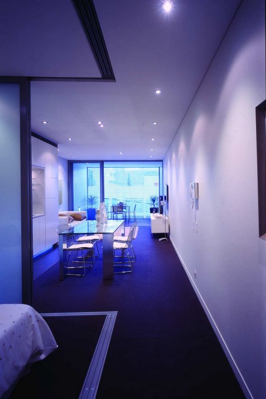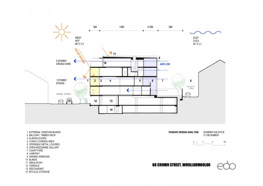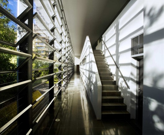 這個住宅項目有一個神奇的走廊結構,它不但是一個美麗的空間,還有非常重要的環境功能。每個公寓都有位于入口大門之上的玻璃通風孔,它們被銅制格子保護。夏季時這個走廊空間可以是清涼空氣的一個熱池,通過公寓激發十字通風。住戶可以在沒有空調和電扇的幫助下得到通風和涼意。公寓之間的十字通風是由走廊較低的溫度引發的,這里的溫度比建筑西側要低15度。