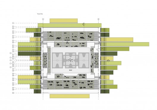 這是一個競賽項目,它要求參賽人員設計四個獨立的體育單元,它們都要位于同一個場地,并且彼此緊密相連,這個作品將一組建筑理解為一個建筑整體,如同一個建造的大陸,不同的元素能夠參與到同樣的技術和空間策略當中,設計呈現出的是一個半覆蓋的公共空間加上體育場所和花園空間。