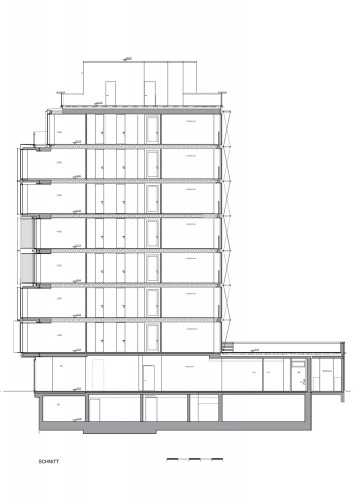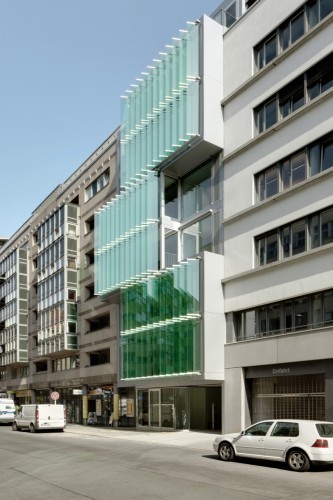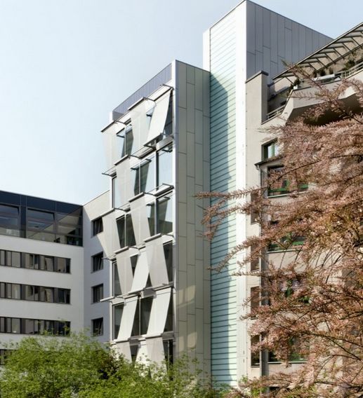 這個大樓位于柏林文化氛圍極其濃厚的地段,呈現出明顯的城市特色,首層是一個像巨大花園一樣的空間,前立面是技術精準,完美透明的垂直玻璃薄層,它們可以阻擋強烈的光照,并能向上外凸。這種效果將建筑與環境相聯系,彰顯出一種個性的都市宣言。防曬措施還包括扭曲的紡織品材料。室內有玻璃,木質材料和紡織品等元素。這個設計將城市與花園融合。可持續也是它的一大特點。