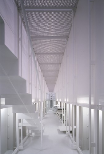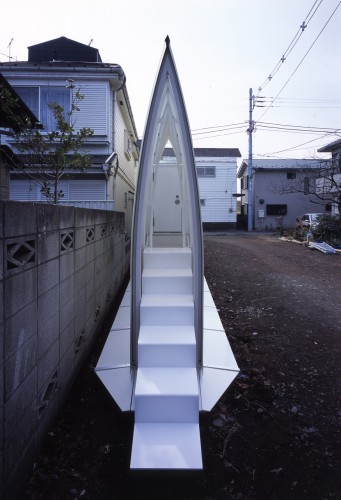 在與日俱增的小場地住宅中,這恐怕是最奇特的一個了,不管是從形狀還是大小來看。它像是一個長長的狹窄的錐形,又像是一個正在張開的風帆,它最大限度地利用地形地勢,以獲取建筑最大的長度,以生成空間,并通過一個斜坡的引入加強建筑的結(jié)構(gòu)性,住宅還最大限度地利用地下空間,將整個地上建筑轉(zhuǎn)變?yōu)橐粚悠つw,透明的表皮將陽光滲入室內(nèi)。地板的材料采用的是延伸的金屬,這樣光線能夠深入地下。