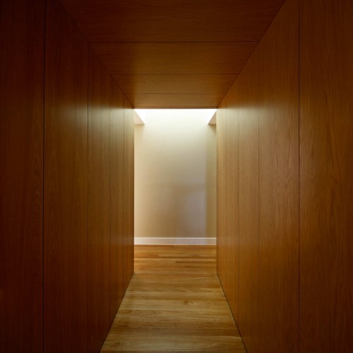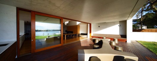 這個(gè)位于河邊的住宅旨在將北側(cè)的河景與南側(cè)的大樹融入到住宅的設(shè)計(jì)當(dāng)中,結(jié)構(gòu)中心是一個(gè)巨大的雙高起居空間,它是住宅的主要空間,能使縱深的空間有開闊的視野,能使人們?cè)谑覂?nèi)深處也能穿透房間,看見河流。場(chǎng)地周圍都是鄰里住宅,為了能將陽(yáng)光透進(jìn)室內(nèi),但同時(shí)保護(hù)隱私,一個(gè)雙層墻壁被建造出來,這個(gè)墻壁在下午將陽(yáng)光灑進(jìn)室內(nèi),營(yíng)造出舒適怡人的氛圍。