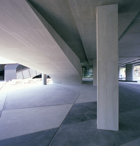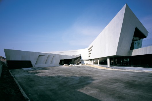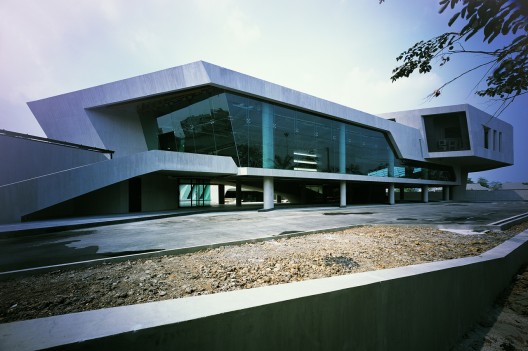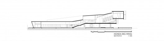 這個(gè)建筑的雕塑般形體是受摩托車(chē)“擁抱彎道”的啟發(fā),它代表賽車(chē)最后沖刺的階段。兩個(gè)回旋鏢似的形狀相互在平面和立面上交織,第一個(gè)從主要入口開(kāi)始,穿過(guò)首層的咖啡廳,然后上升至展示廳,商業(yè)區(qū),教育區(qū),最后下來(lái)到達(dá)倉(cāng)庫(kù)。另一個(gè)回旋結(jié)構(gòu)從夾層休息區(qū)開(kāi)始,然后通過(guò)辦公室和二層的餐廳到達(dá)首層的服務(wù)中心和工作室。灌注的混凝土是建筑的主要元素,它使建筑從室內(nèi)到室外呈現(xiàn)出流線(xiàn)型的統(tǒng)一的強(qiáng)大形體,室內(nèi)流暢的空間隨著室外殼體的流動(dòng)而自然生成。