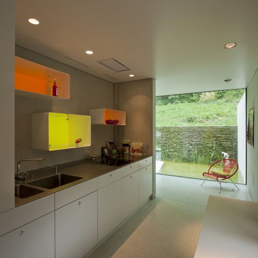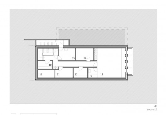 這個住宅位于一個緩緩的斜坡處,建在之前的一個老式浪漫花園和十九世紀別墅里,已有部分,包括一個池塘和一些樹木被完好地保存,并與新建結構相互融合。項目呈現出三層空間,每層都有自己獨特的個性,適合不同的項目需求。首層的休息區和廚房都與室外有著直接的聯系,全透明性和斜坡直直的線條都通過巨大的玻璃開口得到了展現。東側是一個森林和一個小池塘,它們自然形成,將建筑包圍,西側的景色向著花園打開,充滿茂密的植被和生動的水元素。
