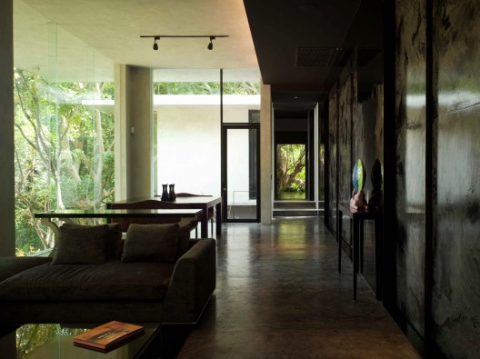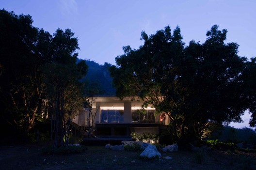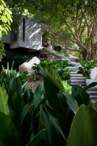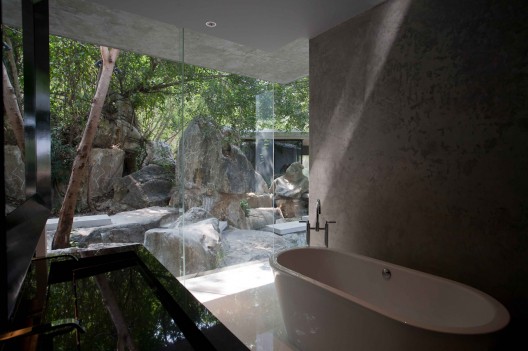 對于這個項目,客戶的要求很簡單,一個單一臥室住宅,輔助其他設施等。這個簡單的要求使設計師有足夠的空間來探索房間之間的關系,室內和室外之間的關系,人造元素和自然元素之間的關系。整體結構理念是基于一些簡單的柱子,它們將住宅抬高,架在一堆石頭上,使原有的景觀輪廓免受影響?;镜牟牧鲜腔炷梁退?,它們表現出自然粗糙的感覺。