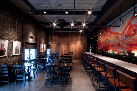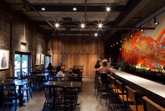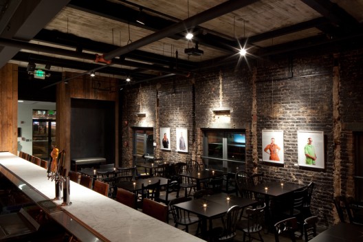 這個咖啡店是一個為期十年的將之前的Patterson劇院改為一個城市藝術(shù)中心和社區(qū)文化區(qū)項(xiàng)目的一部分,經(jīng)費(fèi)的問題和將商業(yè)廚房,酒吧和餐廳插入剩下的1300平方英尺空間內(nèi)為項(xiàng)目帶來了十足的挑戰(zhàn),這個改造需要一種相信一切可能的態(tài)度??臻g的安排是建立在餐廳基礎(chǔ)之上的,與懸浮在原始劇院主要樓層之上的混凝土房間相協(xié)調(diào)一致。舊的表皮,天花板鋼鐵橫梁上的混凝土,室內(nèi)表皮黑色的磚塊等都為結(jié)構(gòu)帶來了豐富的材料感。新材料的使用也是為了補(bǔ)充已有的材料感,同時與主要的巴爾的摩風(fēng)格相聯(lián)系。