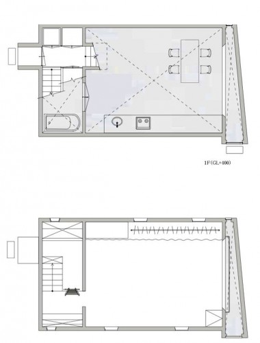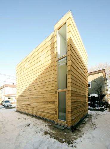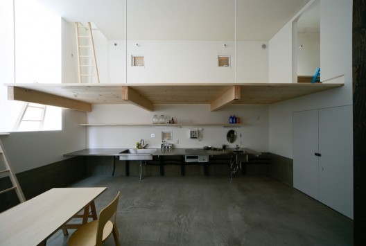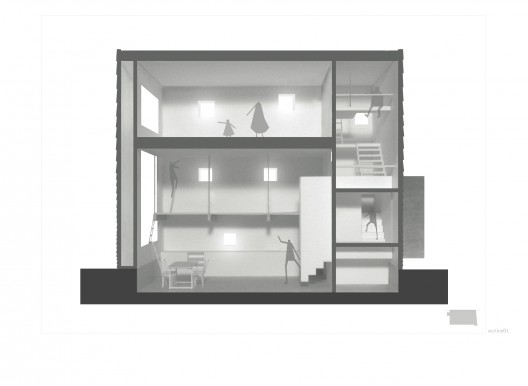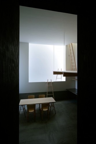 這個建筑的北側部分是樓梯,浴室,入口平臺和其他空間依次排布,它們充當一個緩沖區,隔開公共和私人空間。它們后面是起居空間,它比周圍的房間低600毫米。設計打算設計一個半地下的空間,因此房間的天花板高一些。在一二樓之間有一些地面木板,頂層是一個巨大的臥室。