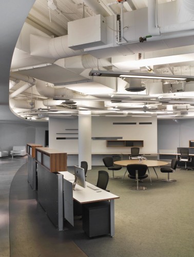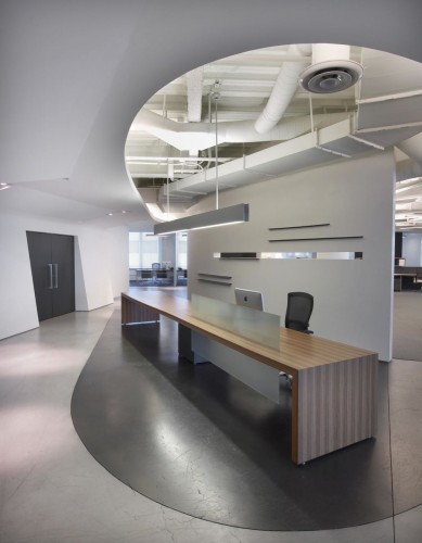 這是一個公司的總部辦公空間,是為一個年輕的混凝土科技發展公司打造的,設計目的是營造一個智慧聚集地,鼓勵互動,并反映他們正在開發的創新綠色產品。這是一個開闊流動的簡約的空間,它能促進員工之間的互動并形成創新的思考方式。一進入空間,人們就會被直接帶入公司中心區,通過互動和交流迅速成為其中的一部分,設計拋開傳統的接待臺和等待區,以一個長長的工作臺代之,用以展示公司產品和充當一個會議桌。雕塑形和精致的建筑元素點綴在暴露的機械結構和粗糙的混凝土地板上,營造出能表達公司產品質感的獨特空間。
