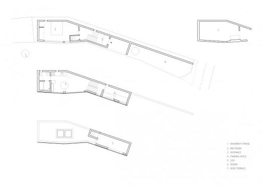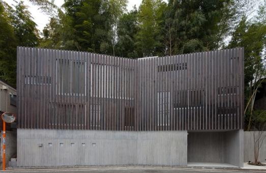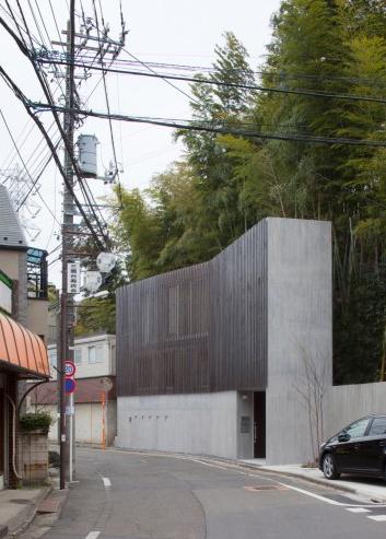 這個項目位于一個非常狹窄的場地上,周圍被小小的街道和竹子山包圍,住宅緊靠山體,是一個單獨家庭住宅,它既是一面擋土墻,又是一個居住空間。出于對樹林的尊重,設(shè)計采用了松木百葉窗和雕浮著木質(zhì)紋理的混凝土,夜晚來臨時,燈光通過垂直的格子細工從室內(nèi)照出來,為空間創(chuàng)造出一種不確定感。