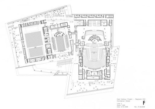 音樂廳和會議中心共占地28000平方米,位于一個獨(dú)立的場地內(nèi),有著朝著海洋和雷克雅維克附近山體的絕佳視野。中心包含一個建筑前面的到達(dá)處和前廳空間,中間是四個大廳,后面是辦公,管理,彩排和更衣室等空間。三個大廳依次排列,公共通道位于南側(cè),后臺通道位于北側(cè)。第四層是一個包含有小型私密展示廳和宴會廳的多功能大廳。從前廳看去,大廳形成一個山形的體量,如同海岸的巖石,與生動和開放的立面形成鮮明的對比。“巖石”中心是建筑最大的大廳,即主要的音樂廳,這是一個充斥著激情紅色的空間。