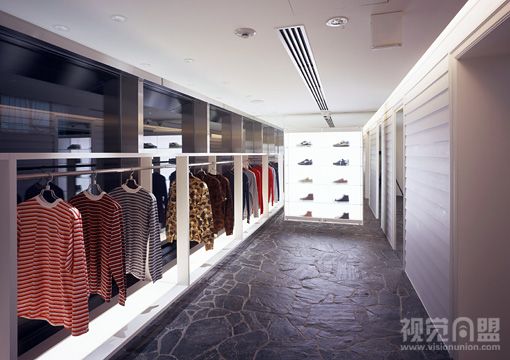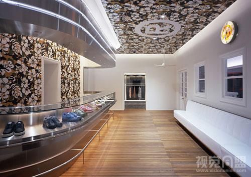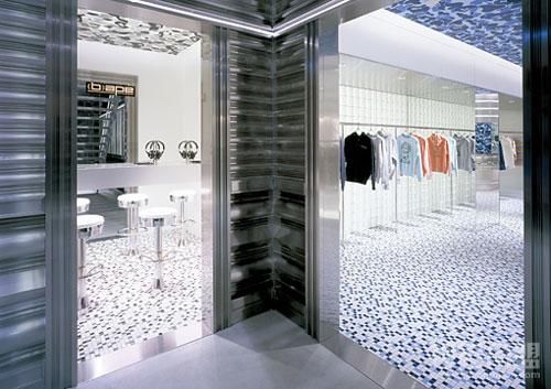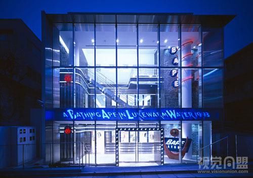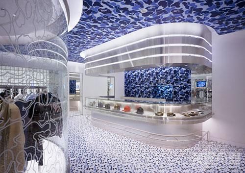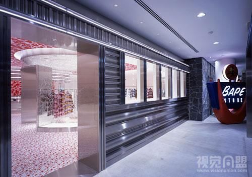 下面就是Wonderwall為Bape新設(shè)計(jì)的專賣店。專賣店外墻采用全玻璃,過(guò)往行人在遠(yuǎn)處就能看到店里的服裝,同時(shí)其夸張、絢爛、大膽、令人有些眼花繚亂的的室內(nèi)設(shè)計(jì),再配以金屬、玻璃的柜臺(tái)和墻面、吊頂?shù)难b飾,讓整個(gè)專賣店十分出眾奪目。夜晚,燈光全部點(diǎn)亮?xí)r是專賣店最漂亮的時(shí)候,此時(shí)它繽紛的色彩和明亮的燈光便將專賣店的美展現(xiàn)的淋漓盡致。
