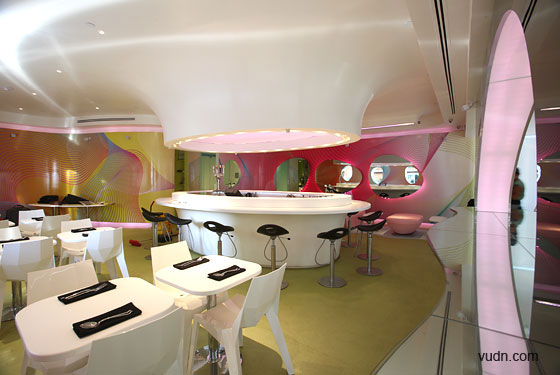 這是一家由加拿大設計師Karim Rashid設計的餐廳室內空間,粉紅色的主流色調和流線行的墻體圖文和家具設計使餐廳顯得格外的溫馨甜蜜。