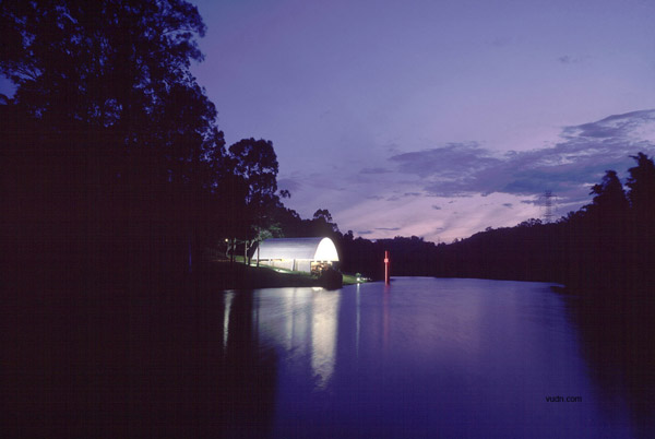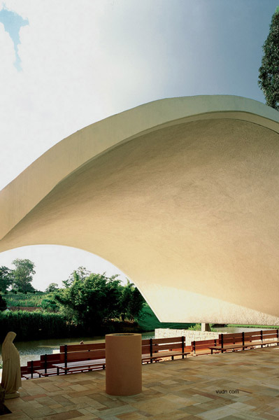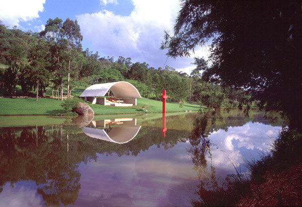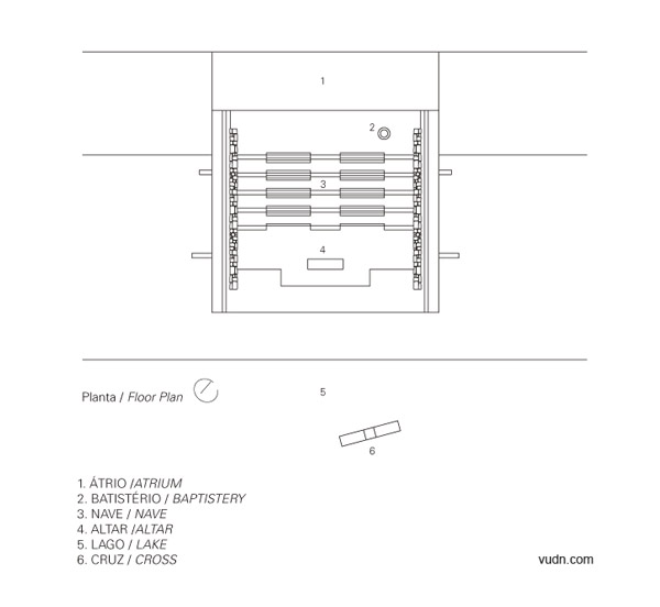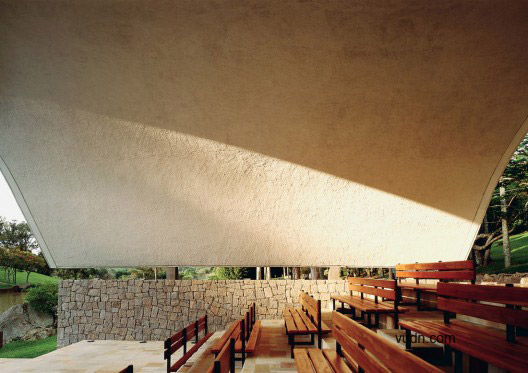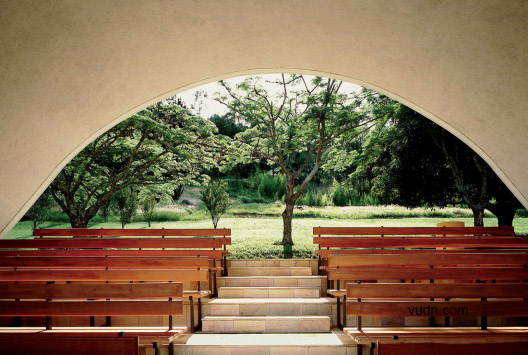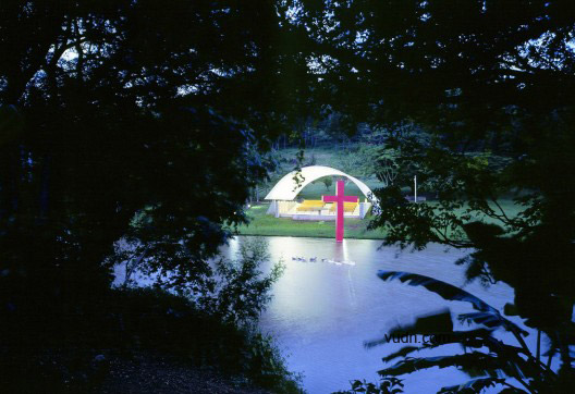 兩個(gè)塑膠元素構(gòu)建了景觀標(biāo)志。兩個(gè)標(biāo)記產(chǎn)生了共鳴。一個(gè),是弧形的屋頂。另外一個(gè),是結(jié)合景觀構(gòu)建的基督教的十字架。這種微妙的關(guān)系創(chuàng)造了湖濱景觀內(nèi)的一個(gè)空間?——農(nóng)場小教堂。流線型的空間暗示了做禮拜的流程——中庭,洗禮池,傾斜殿,祭壇,半圓形后殿,在弧形的屋頂和十字架之后融入了湖光山色中。