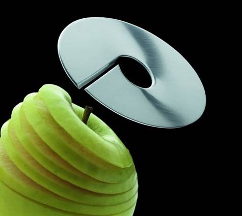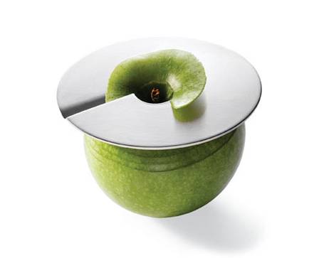 Alelicer是一個轉為削蘋果而設計的工具,當然如果你家的土豆長得非常之圓,也可以用這個來削缺口的部分是一個刀片,沿圓心對稱的另一端,有一個小突起,剛好卡住蘋果,這樣一邊轉動圓刀一邊轉動蘋果,就可以輕松的削完一個蘋果。不過US$38實在是有些離譜,有這價錢夠吃一年蘋果了。